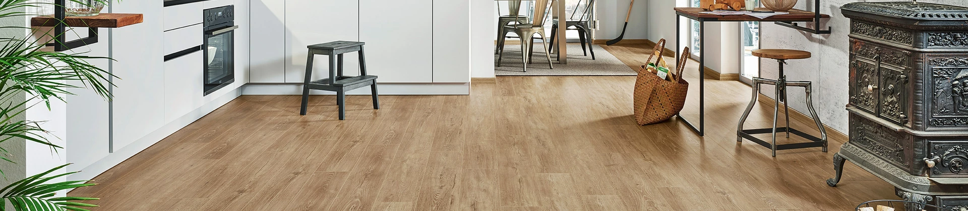 Im Landhausstil eingerichtete Küche. Auf dem Boden ist ein JOKA Laminatboden in natürlicher Holzoptik verlegt.